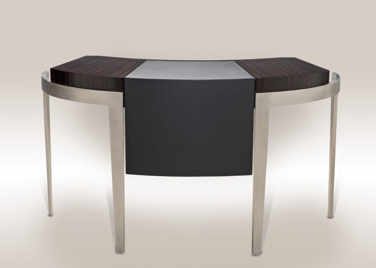 Le Petit Bureau est composé d’un plateau et ceinture en ébène de macassar (essence rare et précieuse), d’un intérieur de tiroir en noyer, d’un piétement inox cintré gainé et d’un sous-main en cuir se prolongeant, côté réception, en paravent de courtoisie.